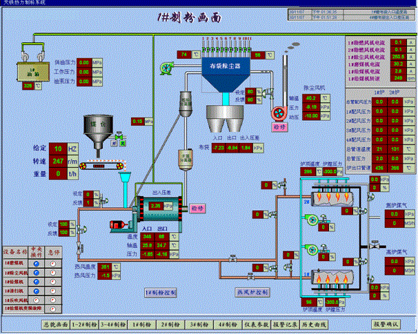 計(jì)算機(jī)PLC監(jiān)控系統(tǒng)的作用是通過(guò)對(duì)制粉和噴煤系統(tǒng)中各種設(shè)備、介質(zhì)在運(yùn)行過(guò)程中的狀態(tài)參數(shù)的實(shí)時(shí)監(jiān)測(cè),為操作人員提供直觀形象的動(dòng)態(tài)數(shù)據(jù)畫(huà)面,并能夠?qū)崿F(xiàn)對(duì)主要設(shè)備遠(yuǎn)程自動(dòng)控制,大大減少工人的勞動(dòng)強(qiáng)度,提高企業(yè)的自動(dòng)化水平